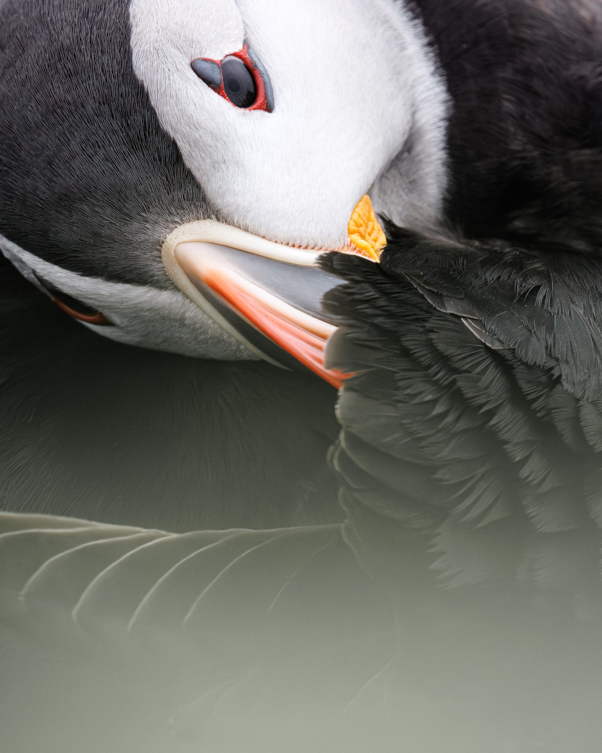 During my last Puffins in the Midnight Sun photo workshop, I focused a lot on closeup portraits showing the behaviour of these beautiful birds. I captured this closeup while a puffin was grooming itself.