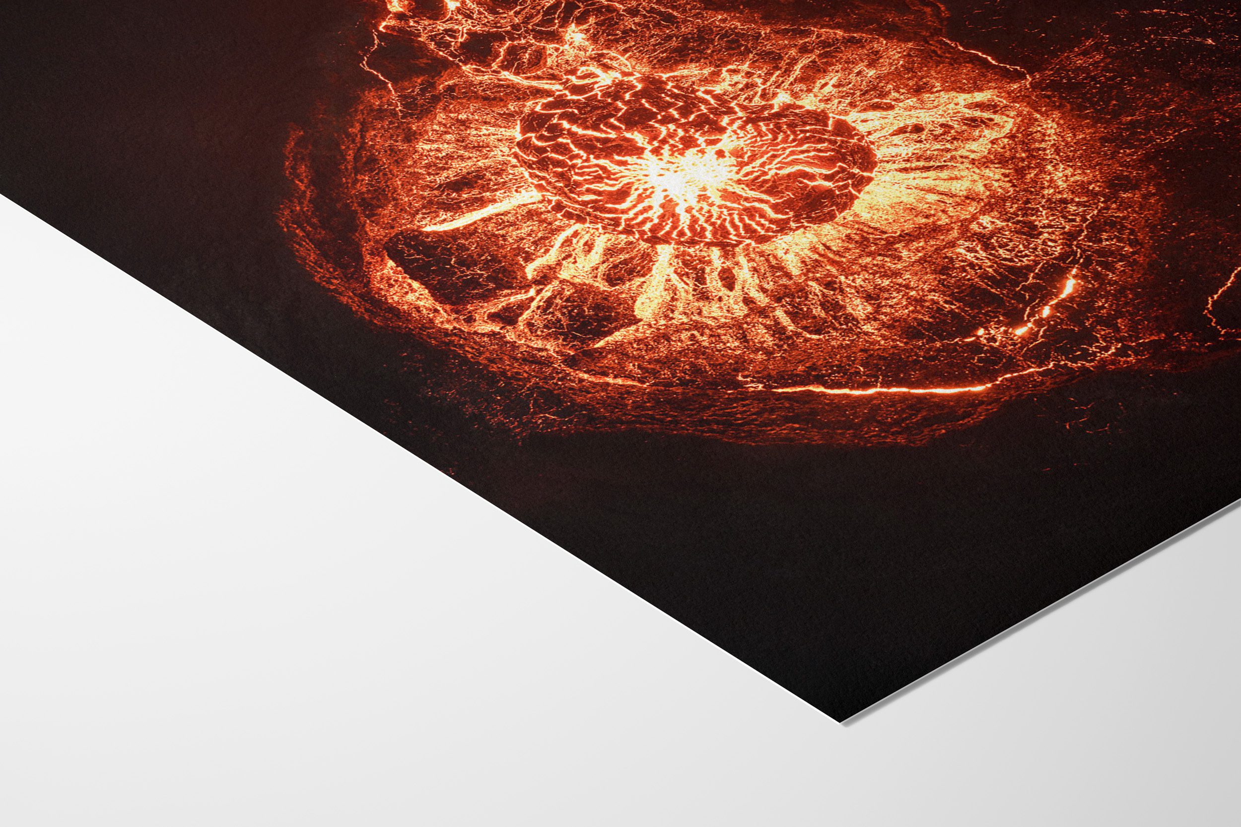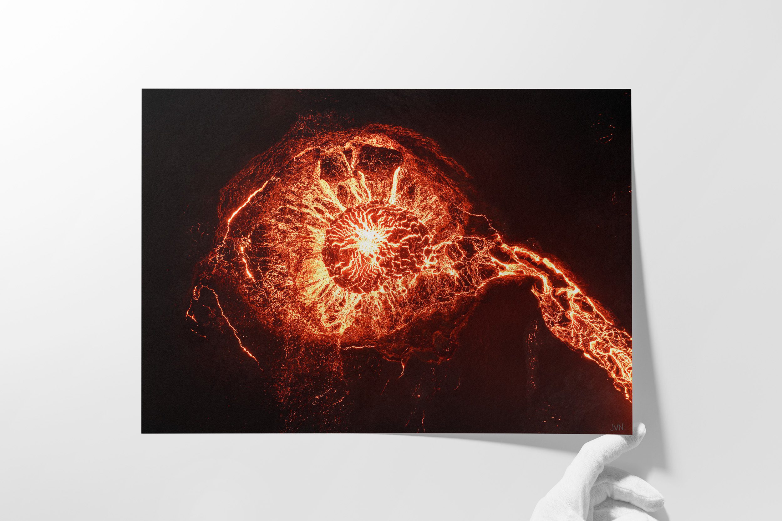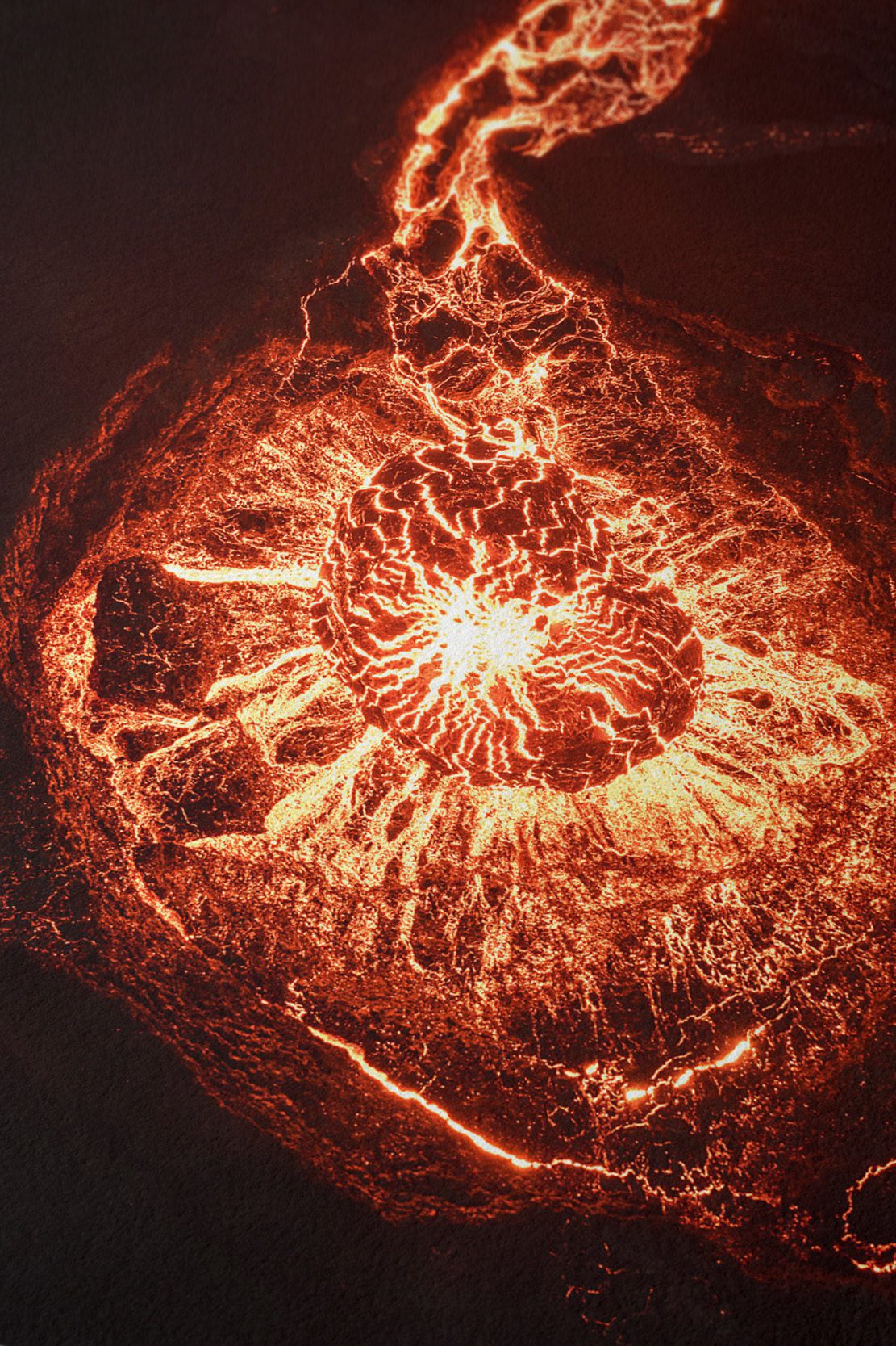 Hraunauga (translation: ‘Lava Eye‘) is a top-down aerial photograph taken during the 2021 Fagradalsfjall eruption.