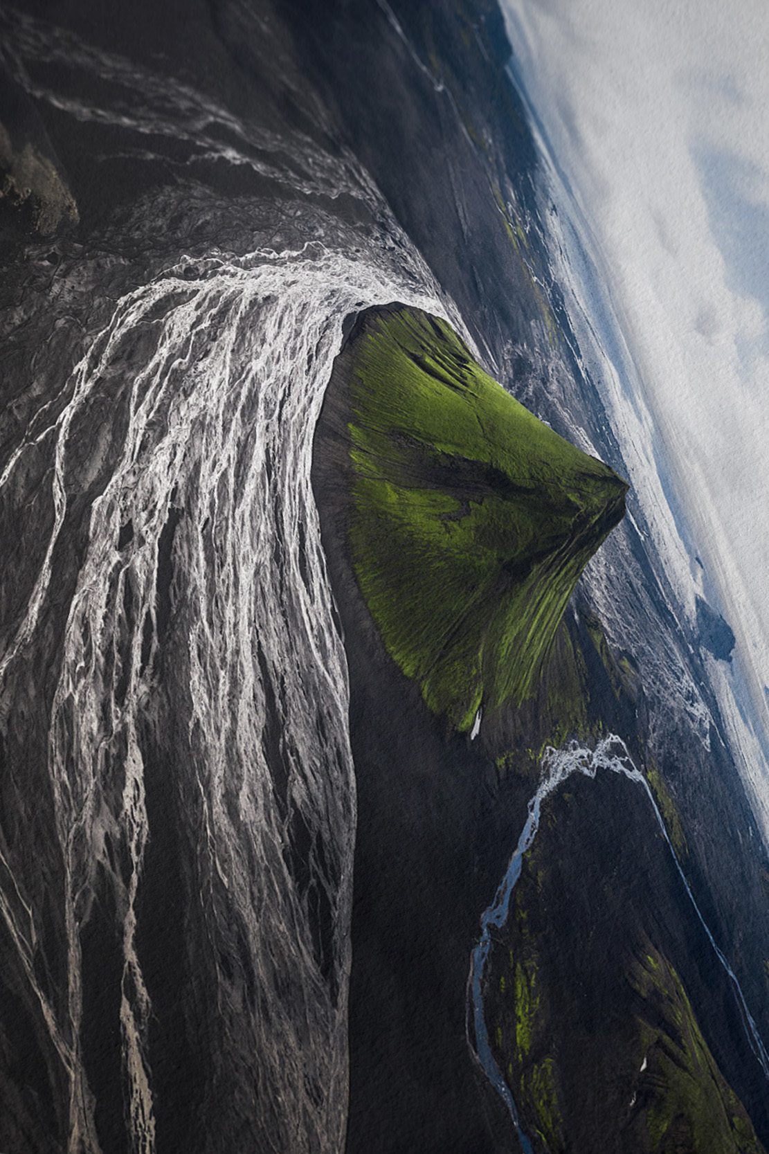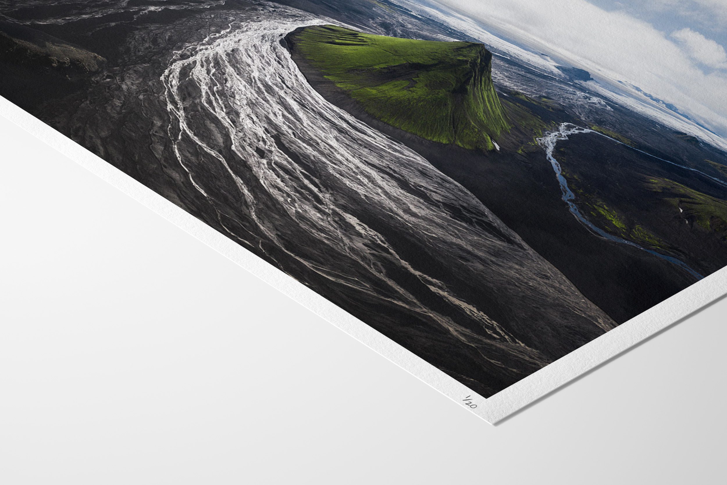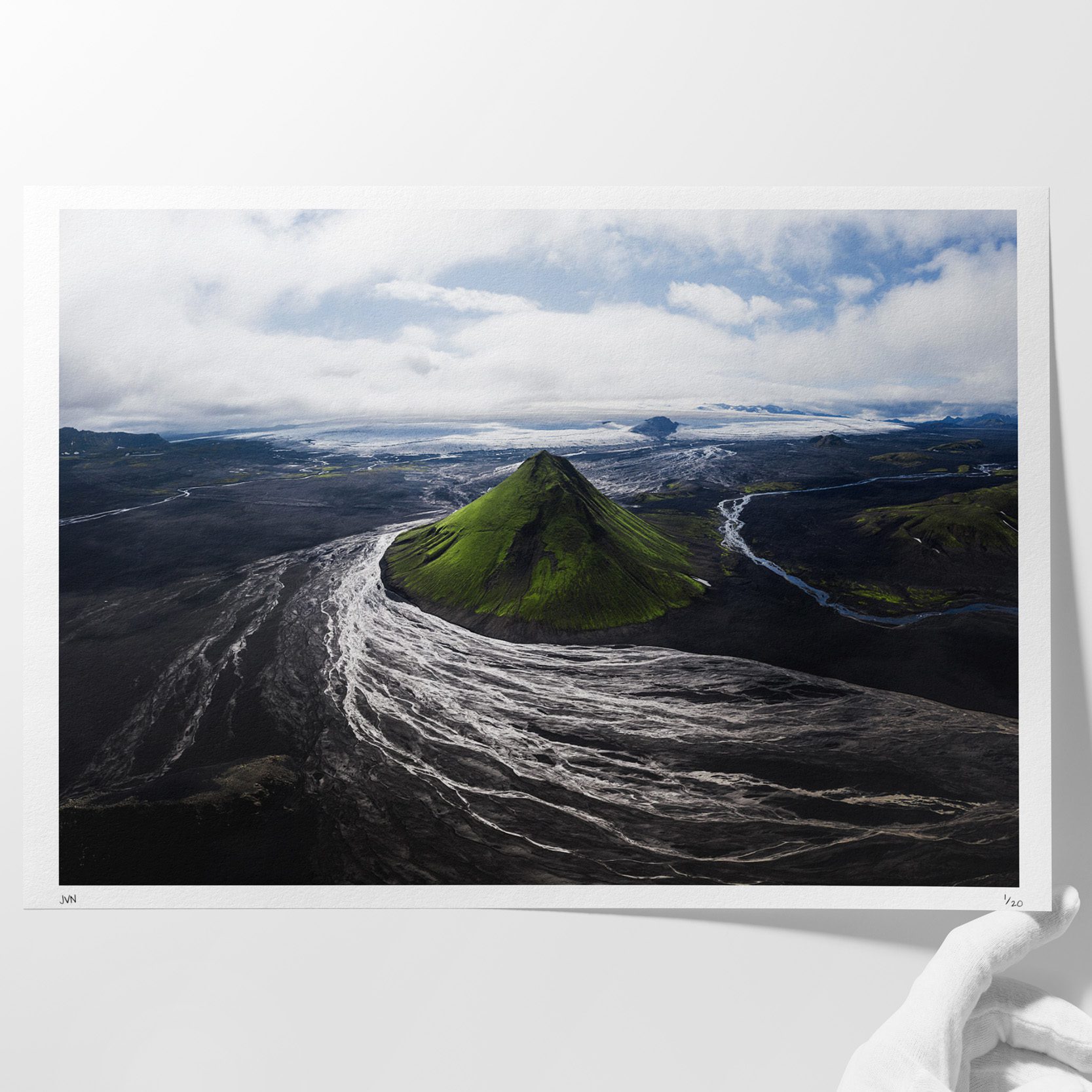 An aerial capture of Mælifell, a cone-shaped mountain, deep in the Icelandic highlands. The mountain is surrounded by a black sand desert, with swirling glacial meltwater surrounding it.