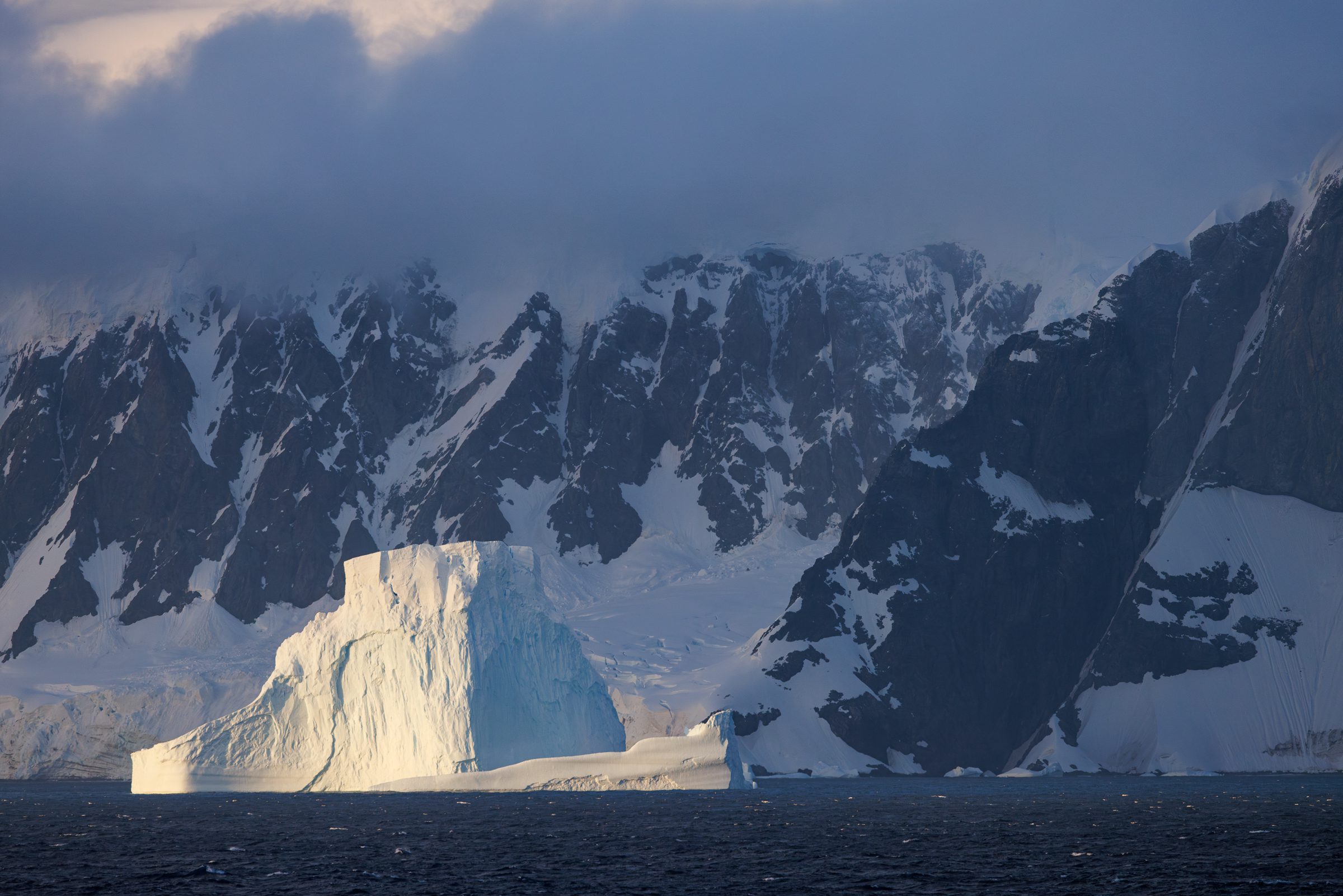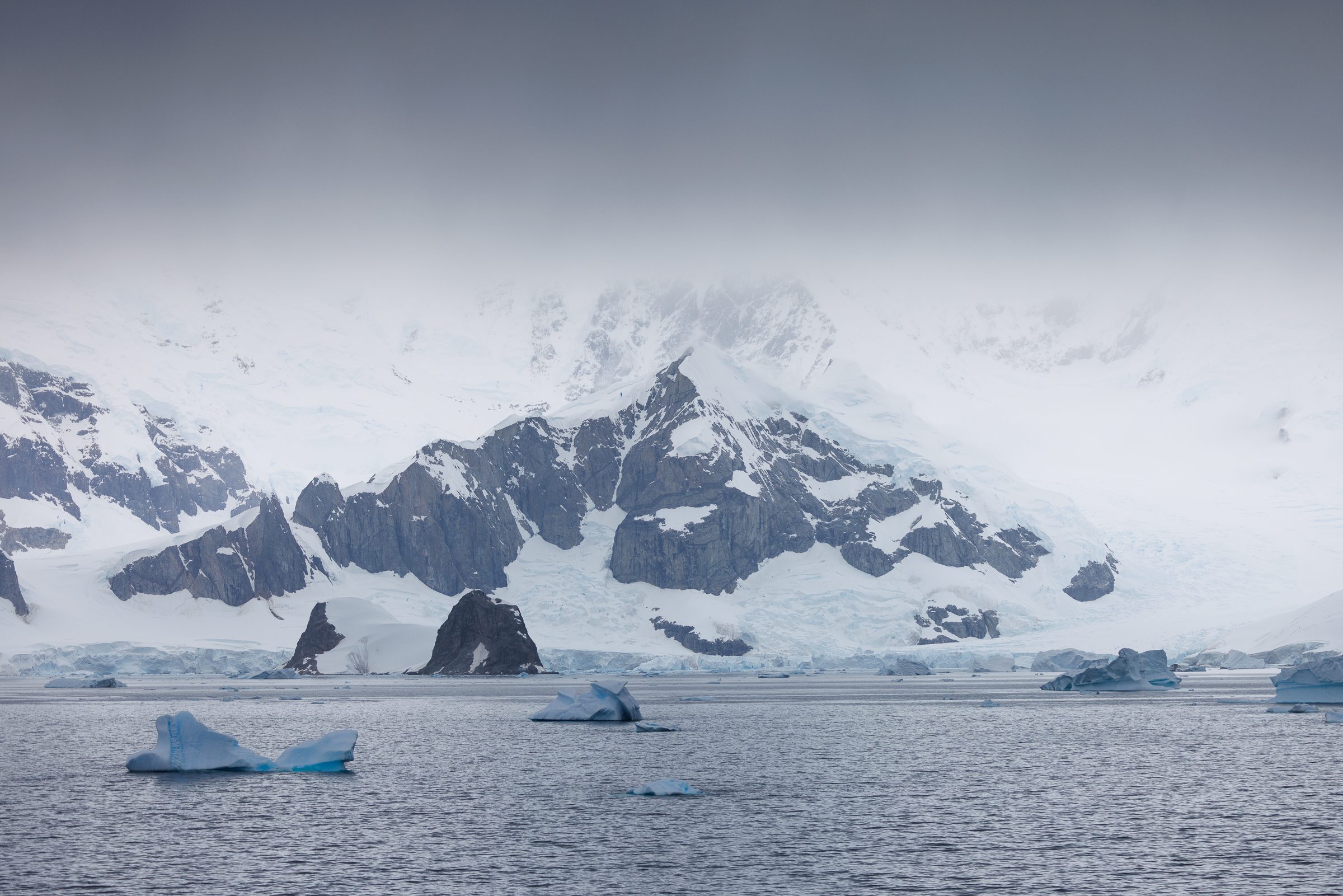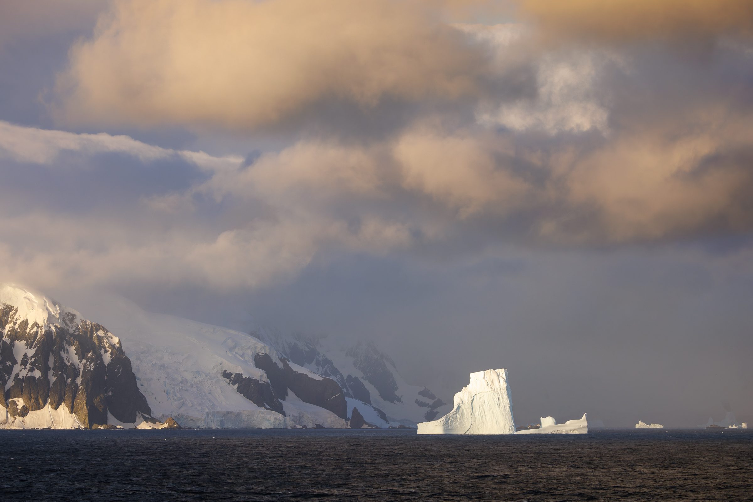 As soon as dawn broke, I grabbed my camera gear and headed out in hopes of seeing a glimpse of the majestic landscape I knew was out there somewhere. It quickly became clear that I wasn’t the only one with that idea, even though it was only 5 am. It seems the ocean hadn’t been too kind to most of us but we were all about to forget that once the first icebergs started being lit up by the rising sun. This sunrise shoot was one of my favourites throughout the whole trip. Perhaps it was the fact it was the first one, or because of the foggy and hazy conditions, but it was absolutely incredible. The light was just right, the icebergs were equally stunning, all with an incredible epic backdrop of mountains towering 1000 metres above the sea level we were on. Showing that scale proved to be very difficult in Antarctica as everything was so big that often you wouldn’t even see the elements that provided scale in the photo, such as birds soaring past.
