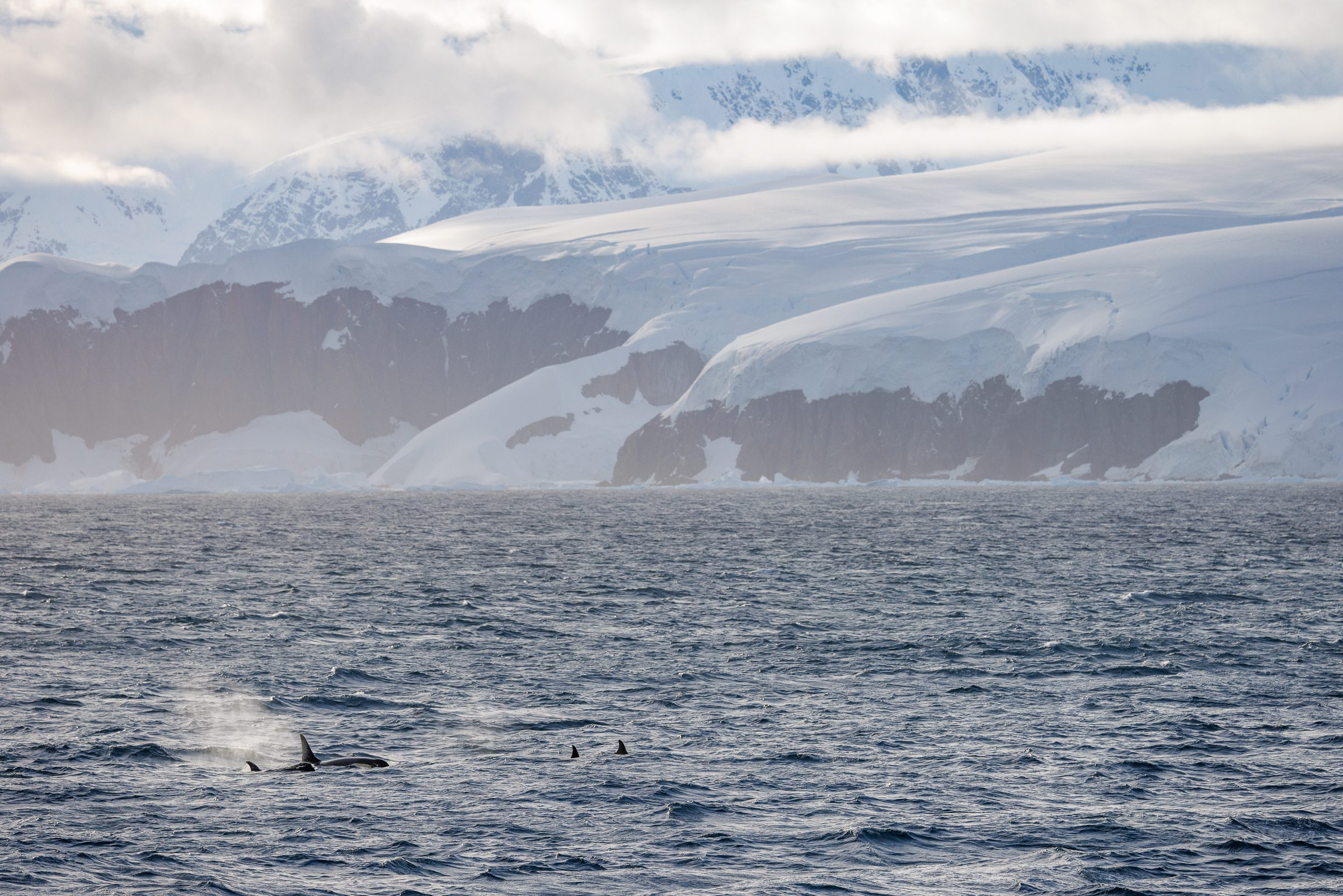 There was only one ‘problem’: how can you put your camera away and have breakfast when something so undeniably beautiful and epic is out there to shoot?! I stayed out until 8am, or until I essentially got too hungry to shoot. Not 5 minutes after I sat down for breakfast, an announcement was made over the ship’s intercom: “There are orcas swimming along the ship!”. I grabbed my camera and ran out of the first door I could find to admire seeing these black and white giants in the grandeur of the Antarctic landscape. Everything was happening really fast, the ship was cruising along and the orcas were everywhere.