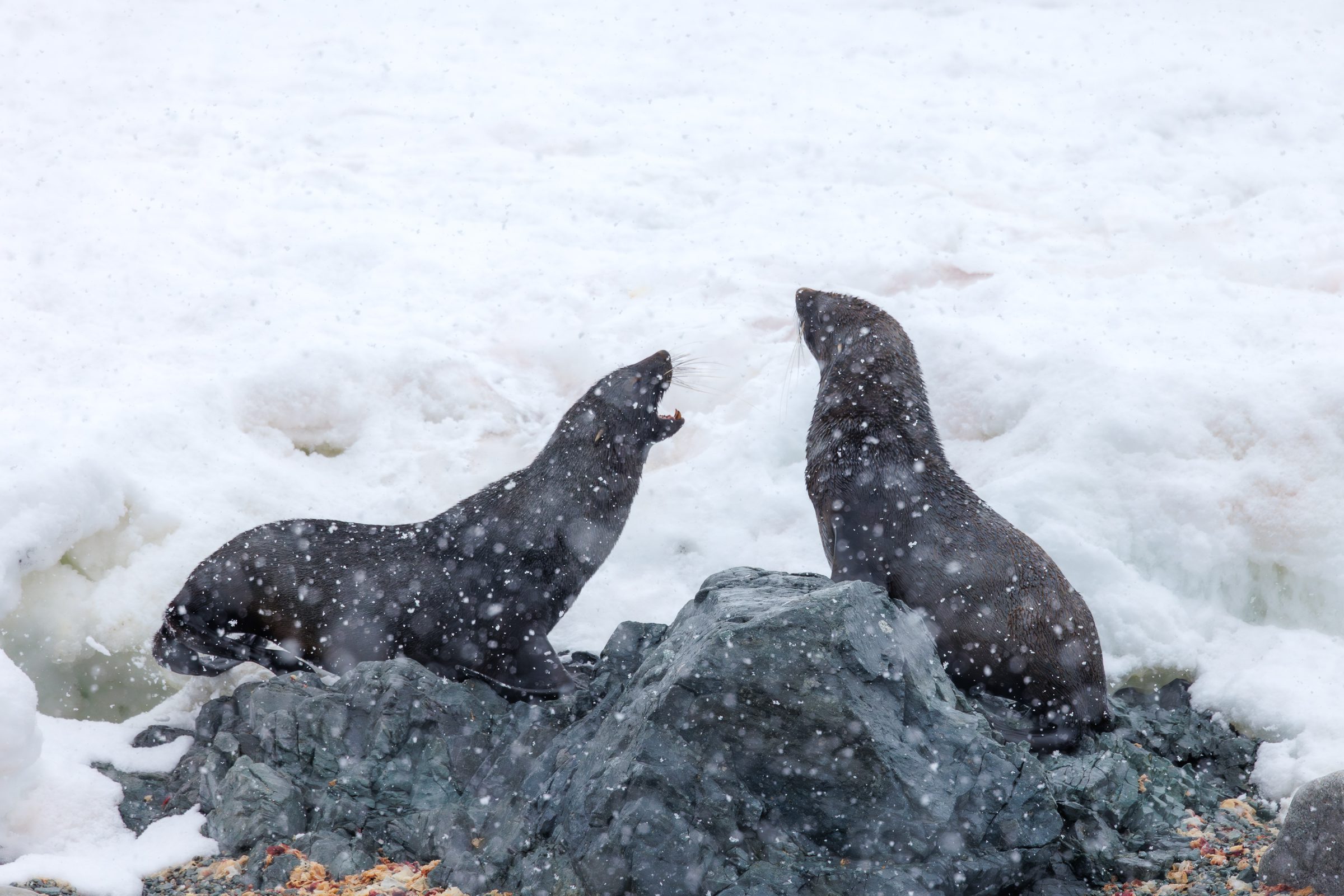 Our first encounter with fur seals, were these two young males who were seemingly play fighting. The snow made it tricky to focus but my Canon EOS R5 did great.