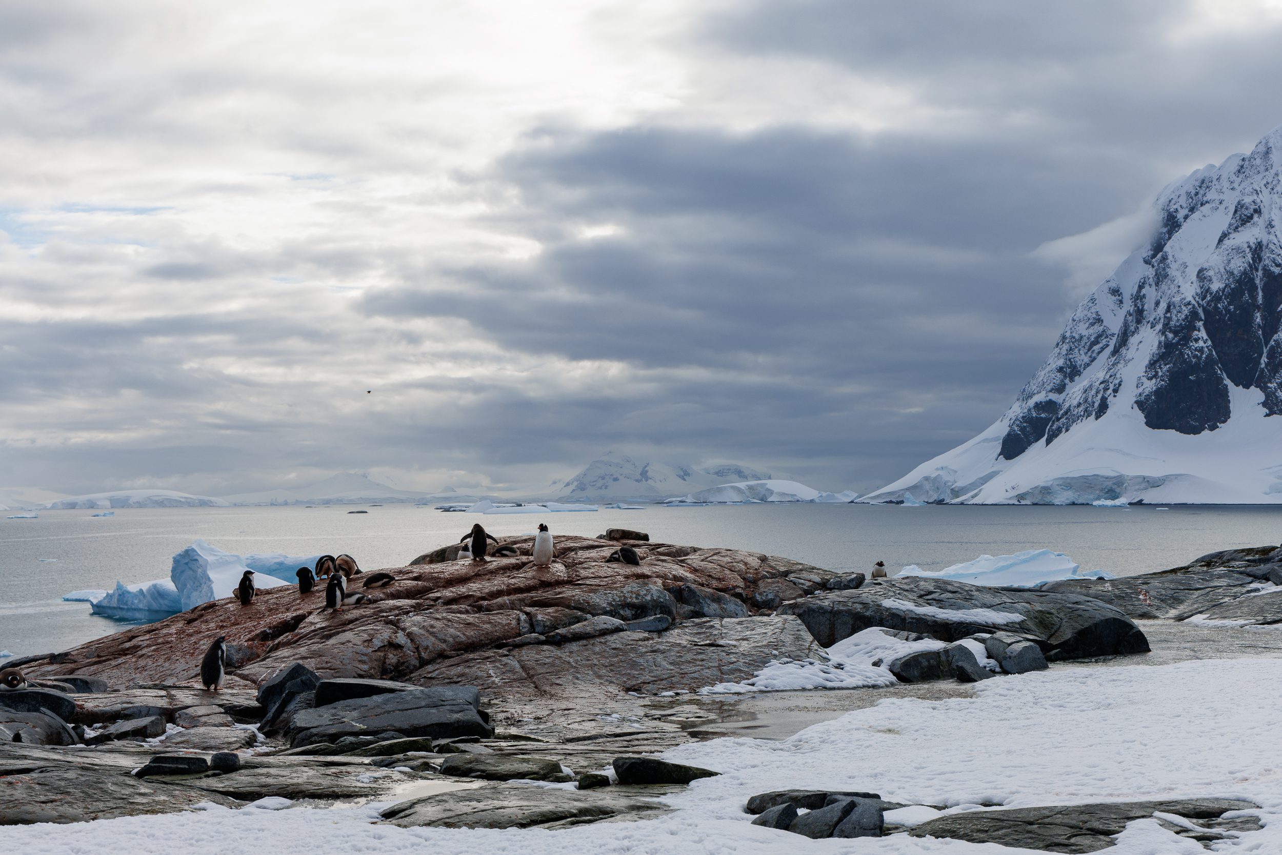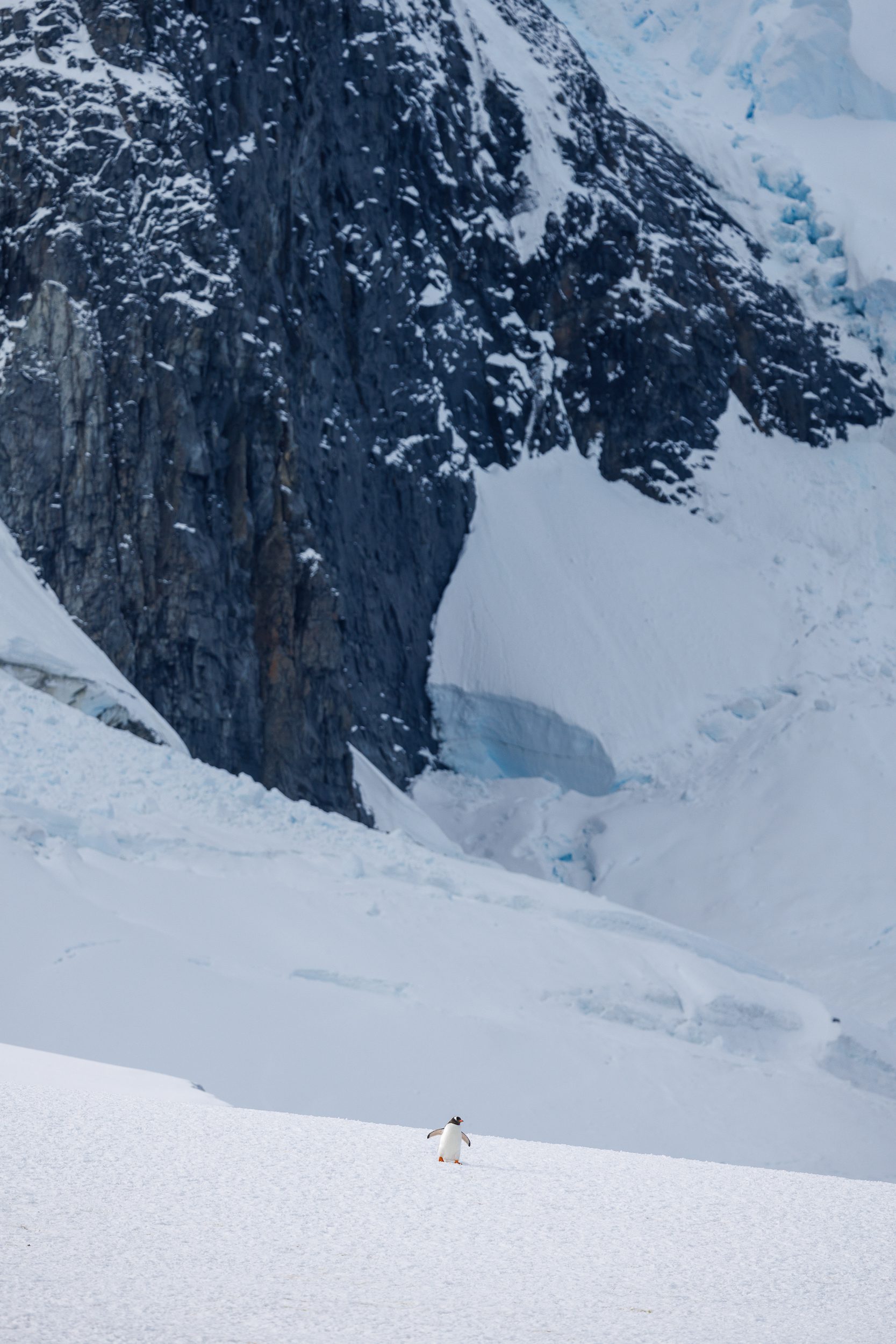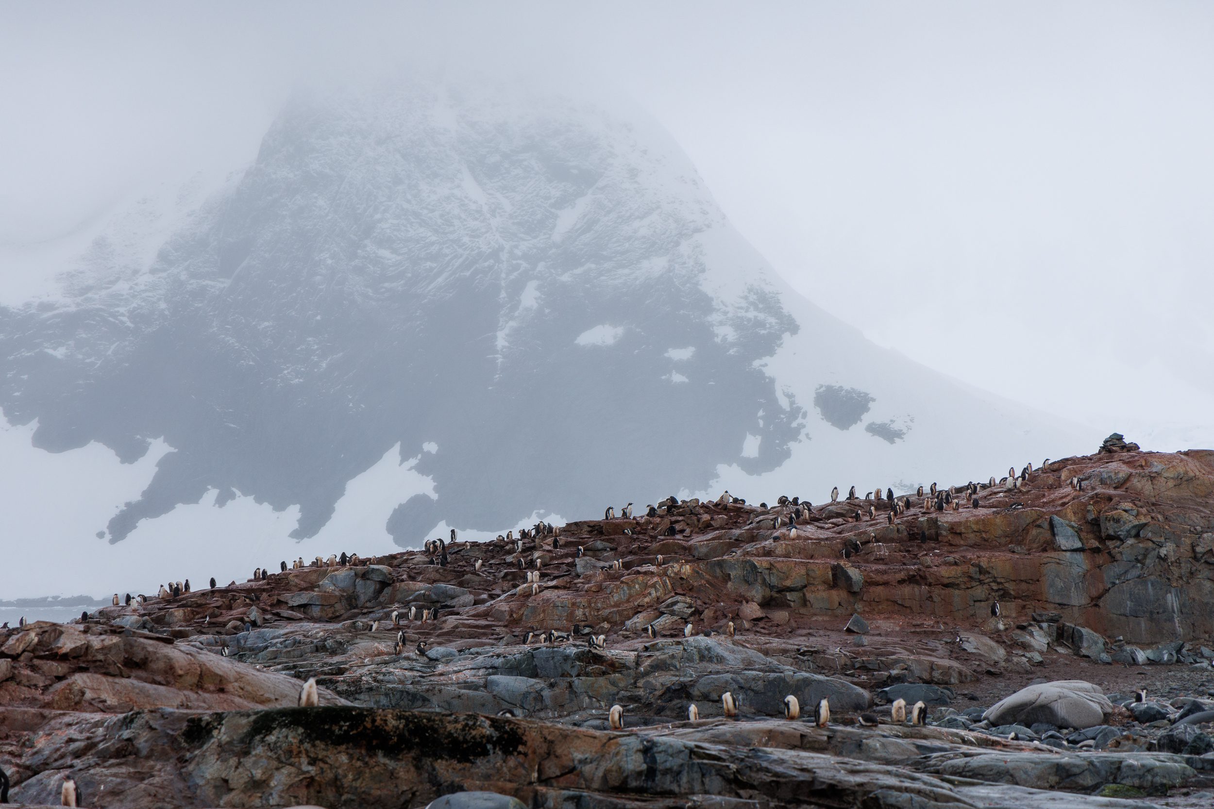 After boarding the Sylvia Earle after the lading, we sailed out of the Iceberg Graveyard and headed North through the Lemaire Channel again. During this second pass, we got much better visibility but at the same time, we were also hit by katabatic winds, which were incredibly brutal and harsh. I didn’t get much out of that second passage in terms of landscape photography but I did get one of my favourite shots of the entire trip. On one of the mountainsides, I spotted a penguin rookery. It was completely surrounded by untouched snow. I used my telephoto lens to really single out the rookery within that huge patch of snow, making it seem as if there’s a strong white vignette around it. However, it’s all natural and I barely even edited the image.