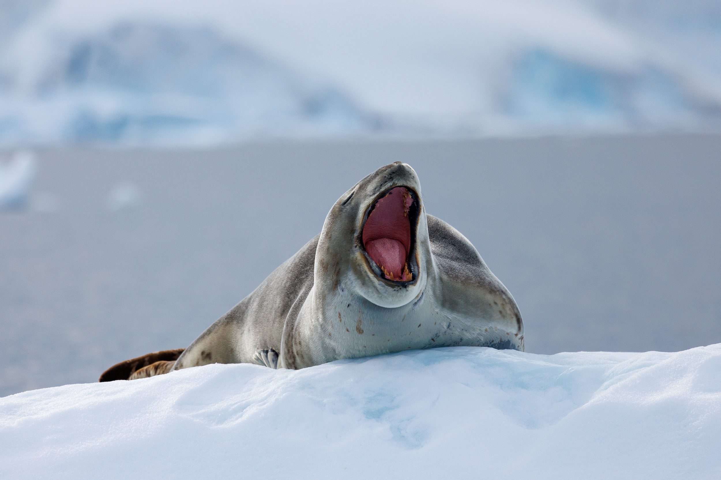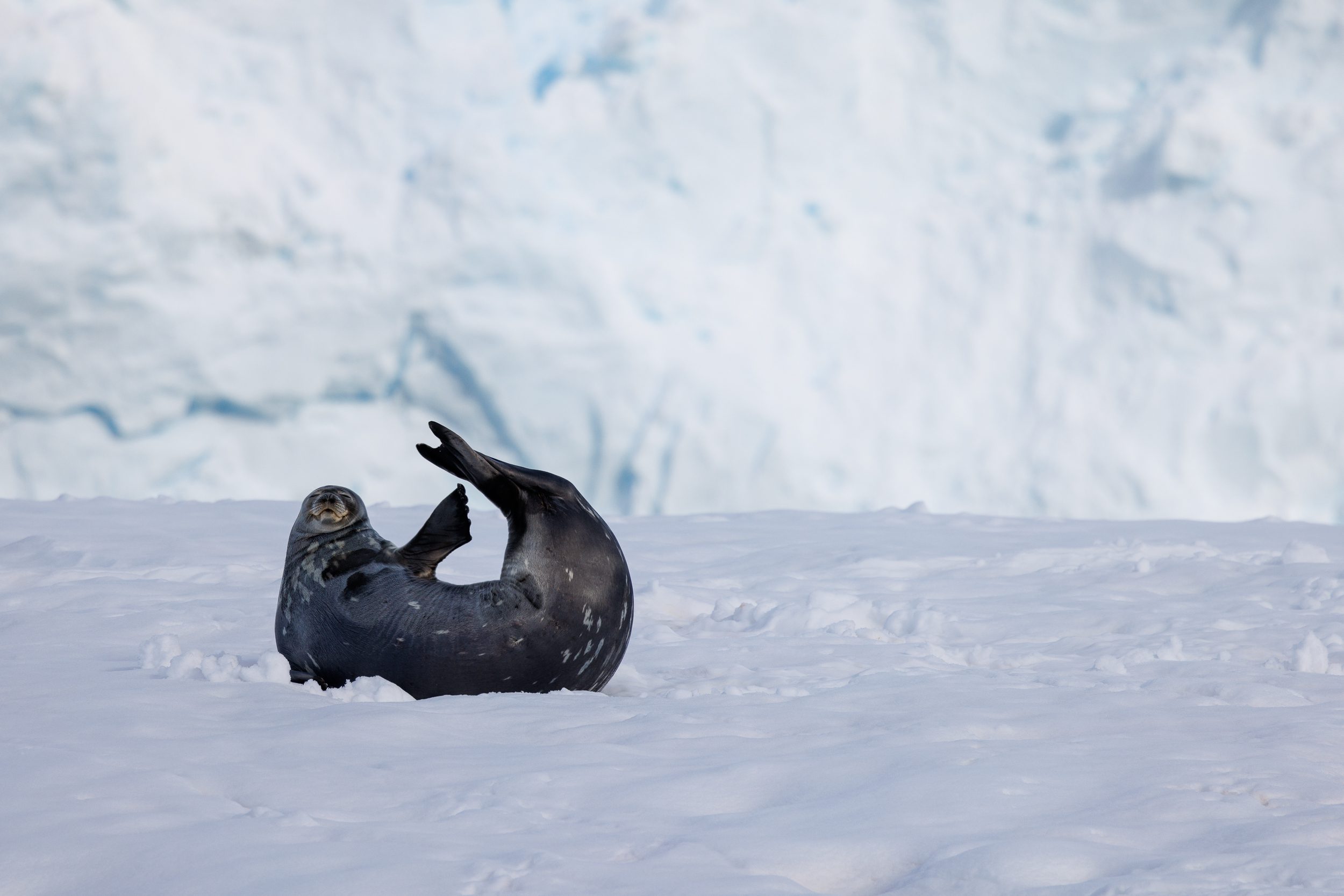 Leaving the Weddell seals behind us, we ventured further into the bay. As we got closer to the glacier, we quickly identified our next ‘target’: a leopard seal lying on an iceberg. It was pretty incredible. Here you have a leopard seal lying on top of an iceberg that’s completely circumventable so we got many opportunities to capture this apex predator in all its glory.