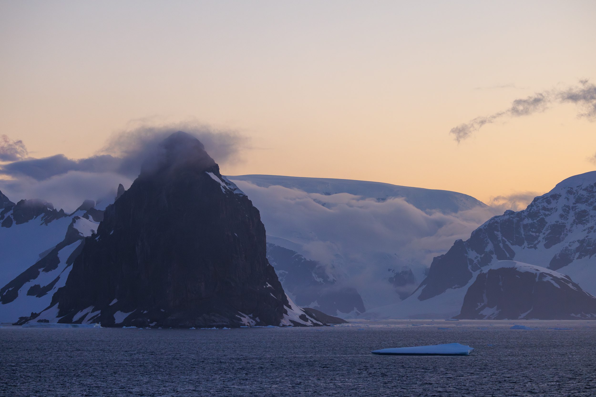 We stayed in Orne Harbour and the ship waited for sunset before continuing our journey. The light was just fantastic. Out of all the sunset opportunities we got, this one was by far the most colourful. Some of the mountains surrounding us were veiled in the most dramatic clouds, adding to the overall atmosphere.