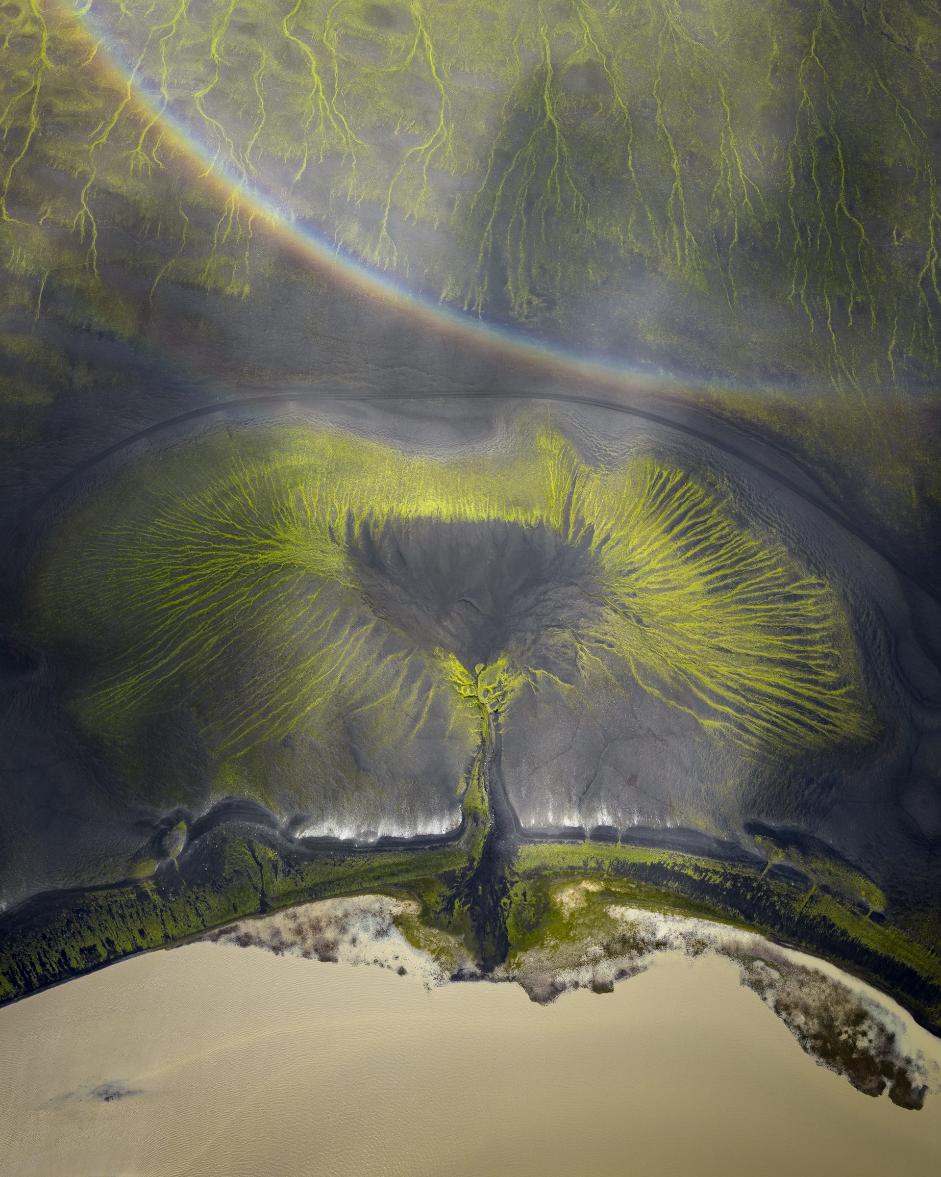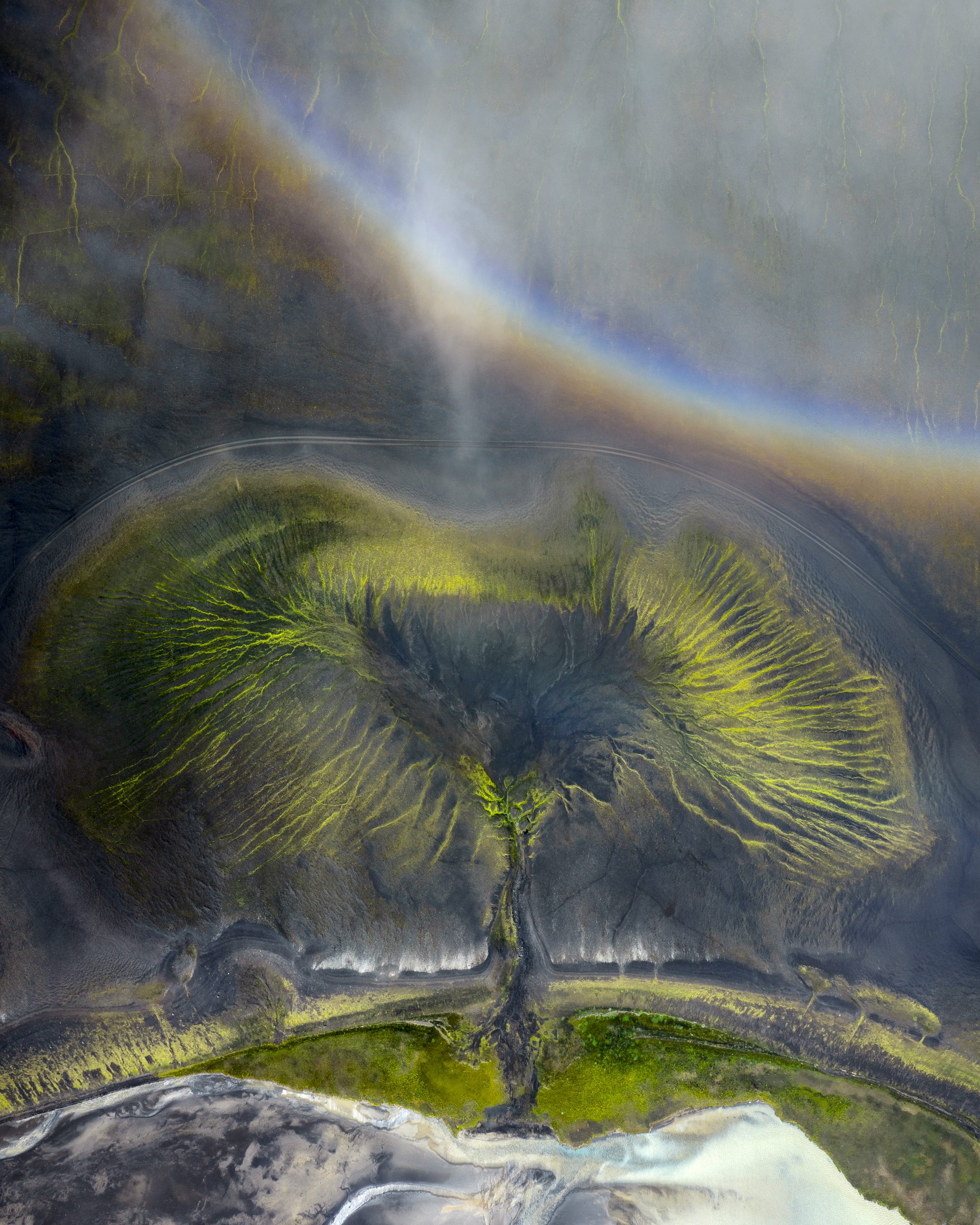 Finally, I created this vertical panorama in a more unconventional way where I actually tilted the camera, rather than moved the drone, to get the position of the rainbow right. Because I kept the angle of tilt small, it still looks like it was shot straight down.