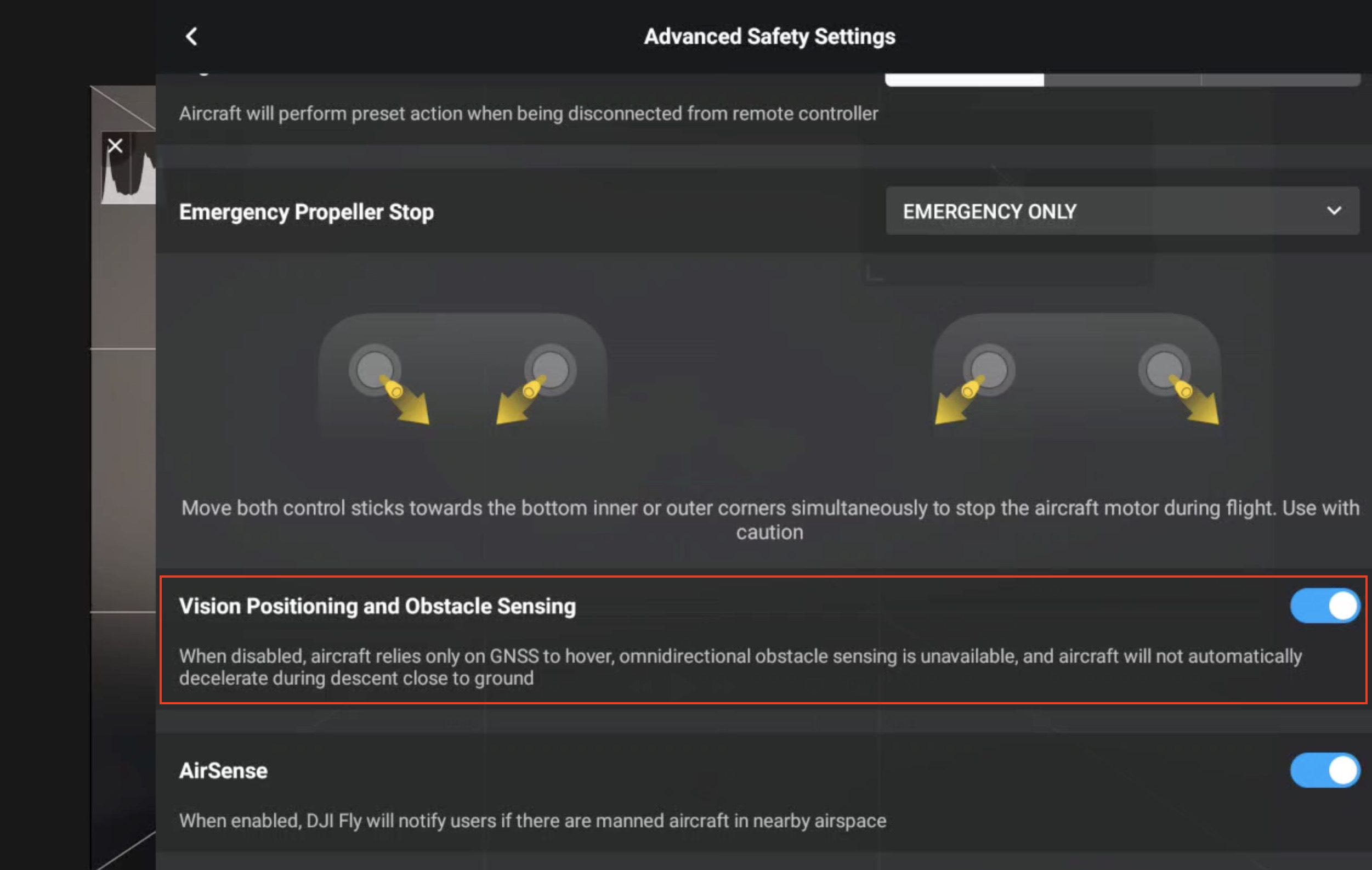 The obstacle avoidance and vision sensors can be easily disabled in the DJI Fly app on either your smartphone or dedicated controller.