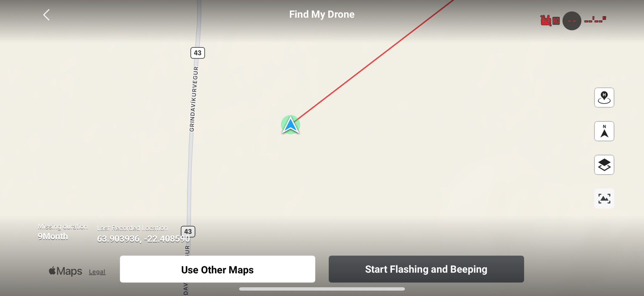 - At the bottom left, you will see the last recorded location of your drone.