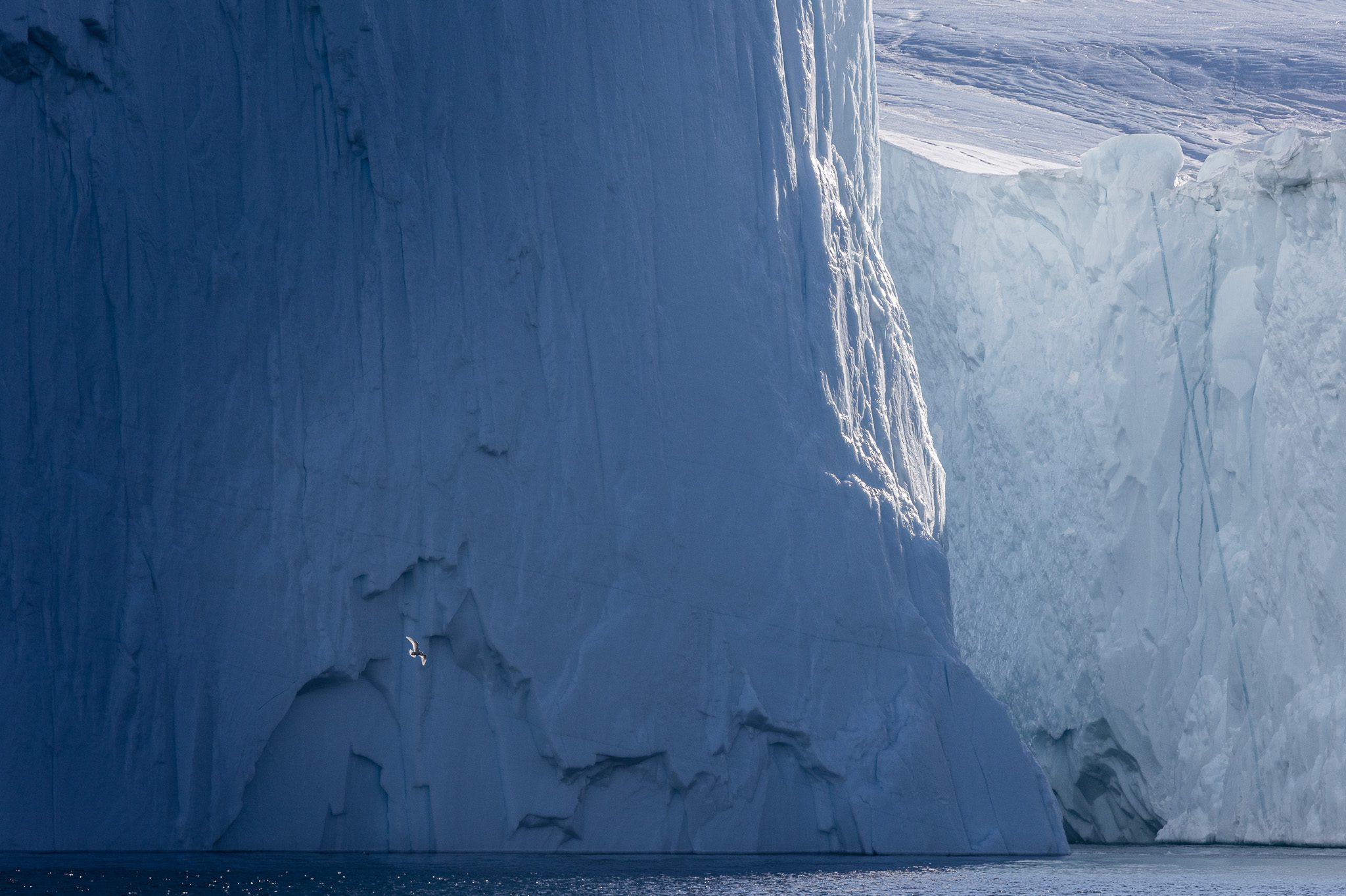What’s really challenging in such a vast environment is finding elements to provide scale in your photographs. Some of the icebergs you see are larger than an apartment building. Especially because you’re out on the water, there are very few elements that can help you. However, even in these extreme temperatures, there is birdlife around the icebergs. Around the larger icebergs, you will find seagulls, ravens and even eider ducks. In this particular image, I used a seagull which was soaring near one of the larger icebergs to provide a sense of scale. To capture this single image, I took about 30 photographs in burst mode so the bird would be in the right place in at least one of my images.