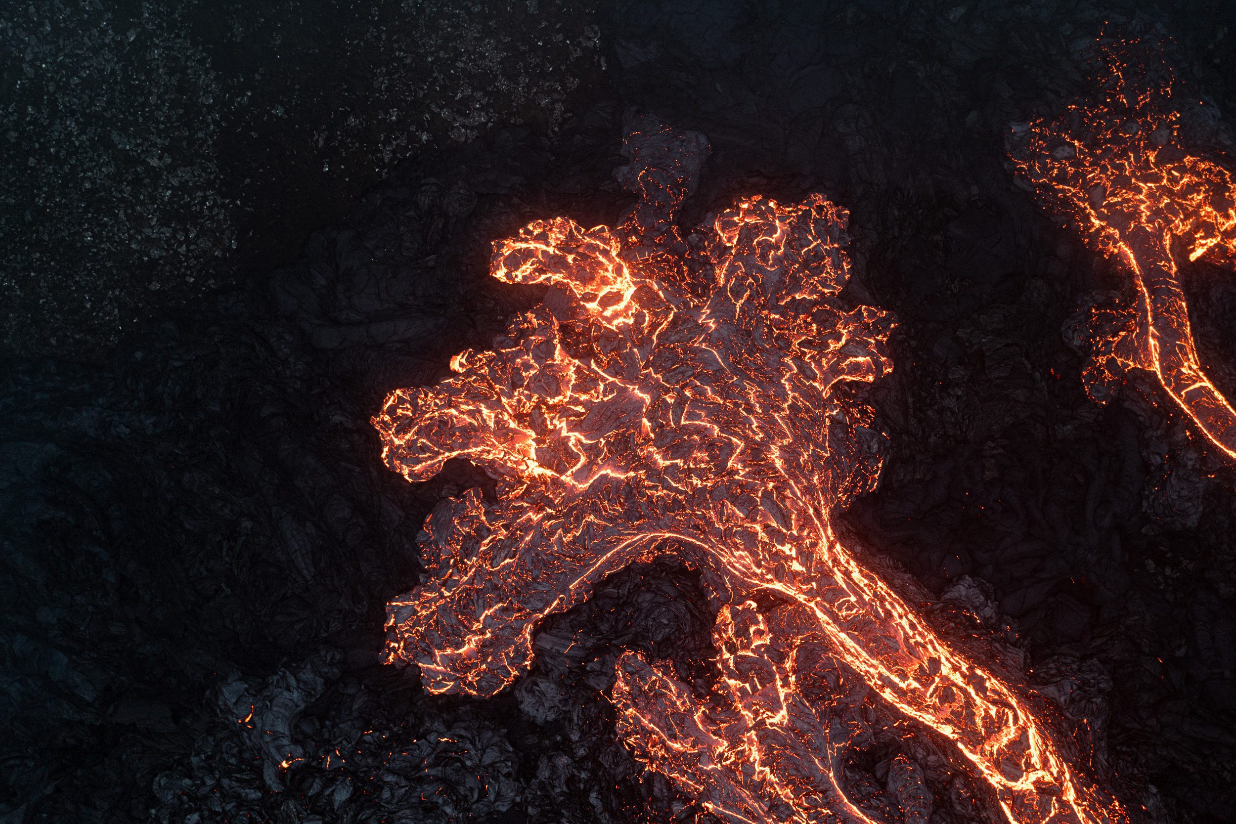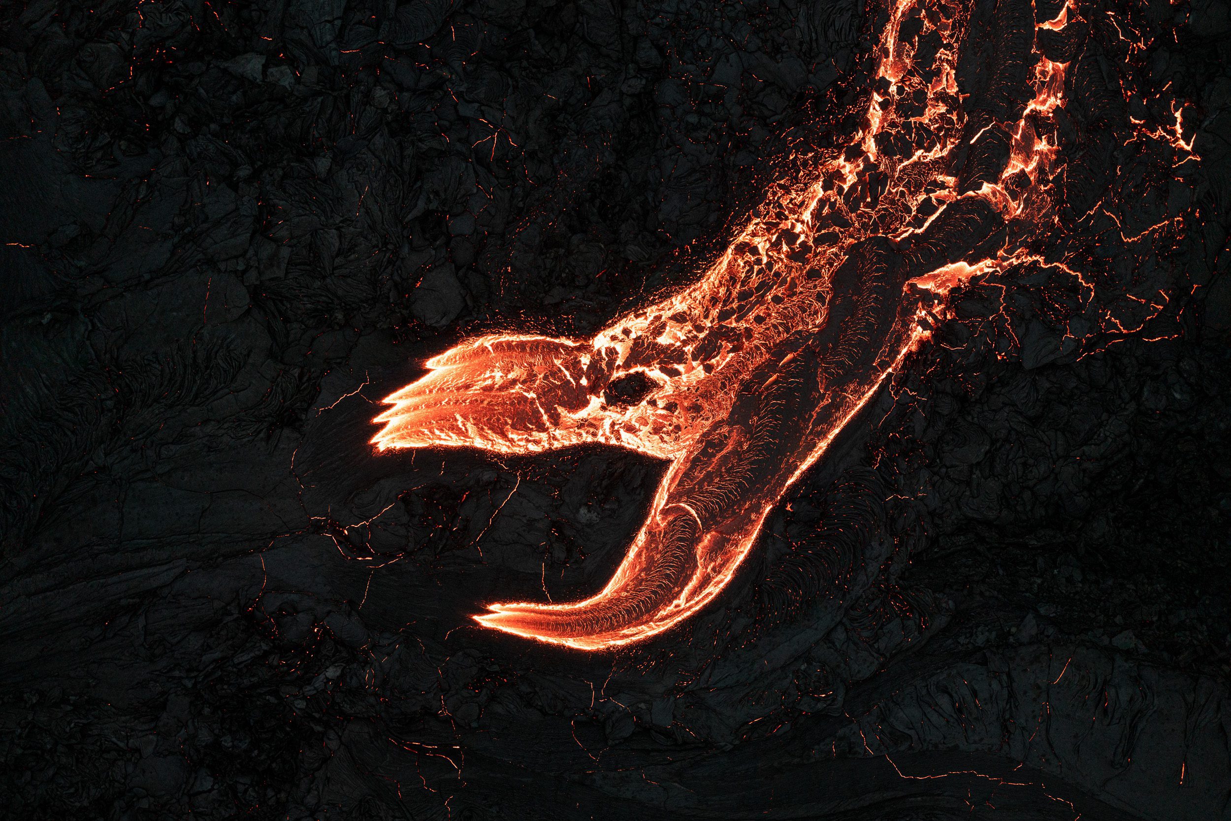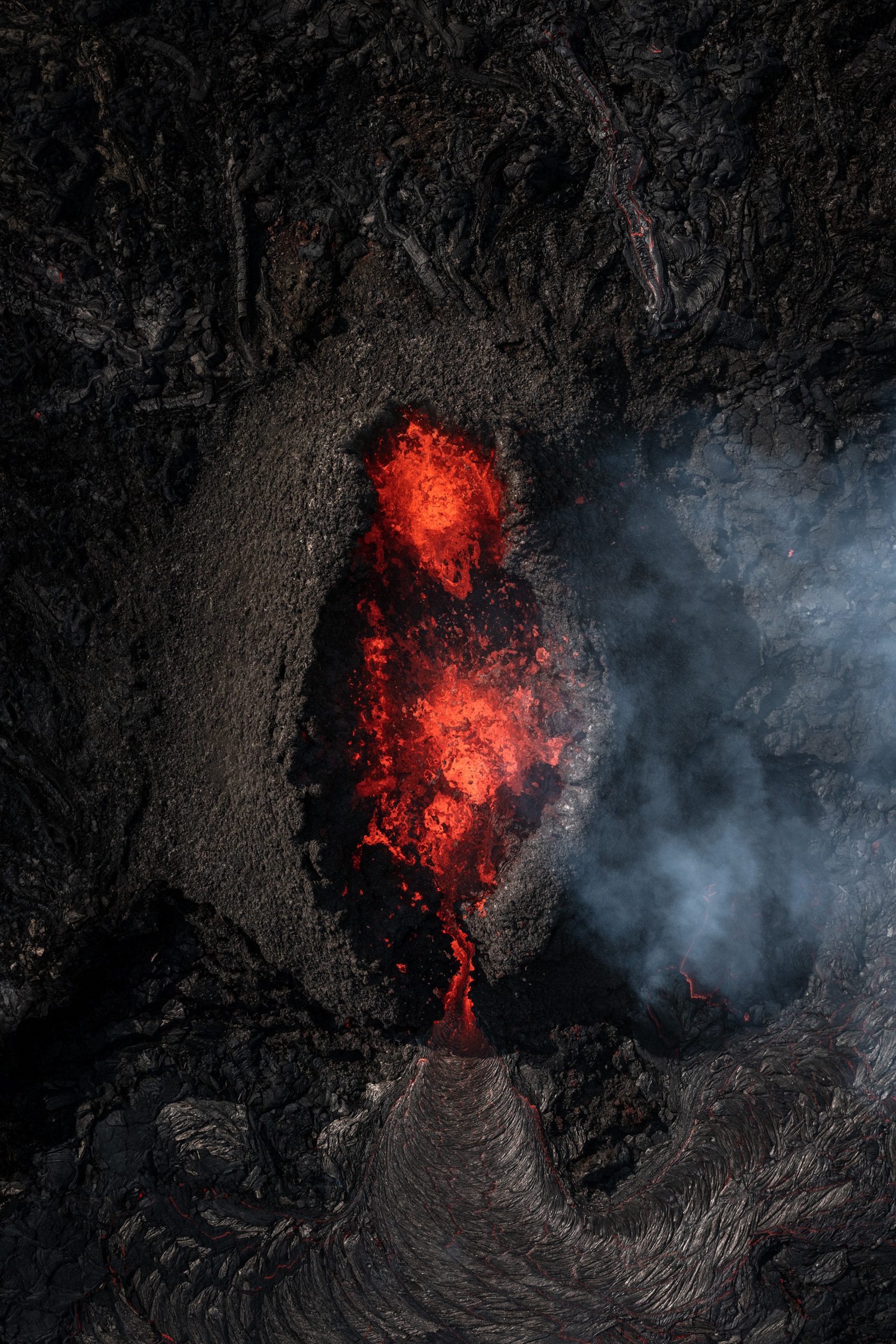 The past two weeks, I’ve been focusing on the insides of the crater and also photographing more patterns in the ever expanding lava field. Because the crater has grown so big, and it has this geyser-activity, it’s been incredibly interesting to document what’s going on inside of it. I’ve made several photographs looking at the insides and even filmed the whole eruption from a safe height. It’s always a bit of a gamble to fly with your drone above and around an active eruption. Truth be told: I really don’t know how close I can get and every time I tend to become a little bit riskier with flying it close. It’s impossible to know how high above the lava you actually are as you can only see the height relative to where you took off. Below are a few of my latest drone-made captures. I love looking for patterns within the lava field. Can you recognise the eye and the dragon’s head & neck?