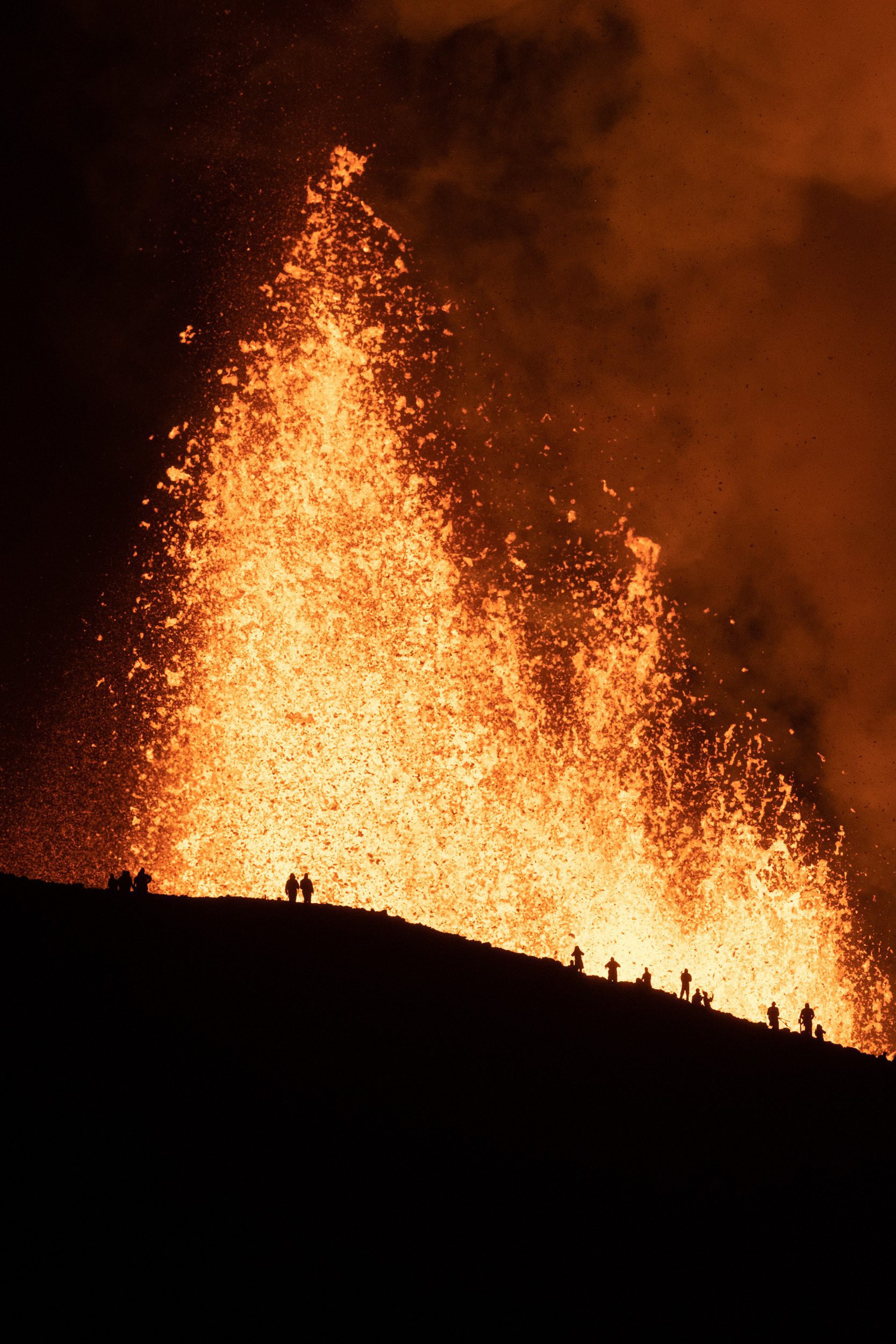 With the lava fountain shooting higher and higher, I wanted to try something different. I wanted to try and capture the scale of it, which is not straightforward because you can’t really put anyone right next to it. I started out with trying to photograph my friend’s silhouette while we were both on the mountain side, which didn’t really give me the desired effect. Though the photograph looked very impressive, it didn’t really do the scale of it all justice. So I ended up hiking back down into the valley until I was about 1 kilometre from the erupting crater. There I could see the tiny people standing on the mountain, while the lava was shooting up behind them. Because I couldn’t see the crater from where I was sitting, I was relying on the light coming from the lava to know when it would go off. When it starts to erupt, you can see the whole area light up with orange light as if you would be standing in a massive city. I spent about 40 minutes photographing there until I got the shots I was happy with. Because the height of the erupting lava always changes, I had to give it several attempts.