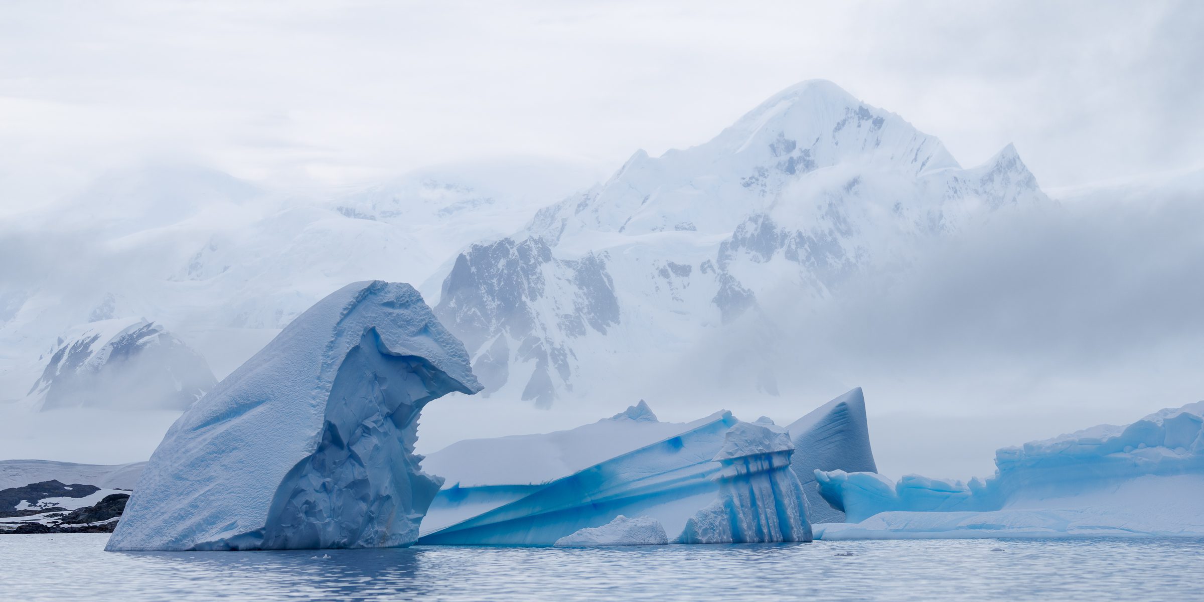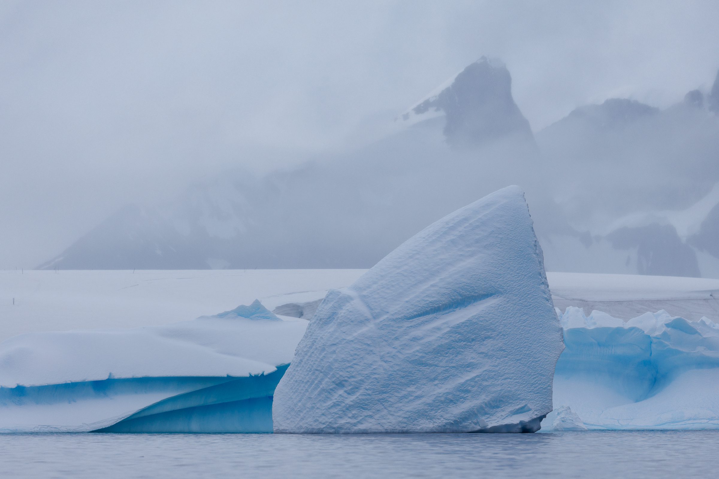 Whilst being on a zodiac cruise near the Ukrainian Vernadsky research station, the clouds began lifting and created a beautiful foggy atmosphere. Fortunately, we were quick to find some interesting icebergs to complement the mountains in the back.