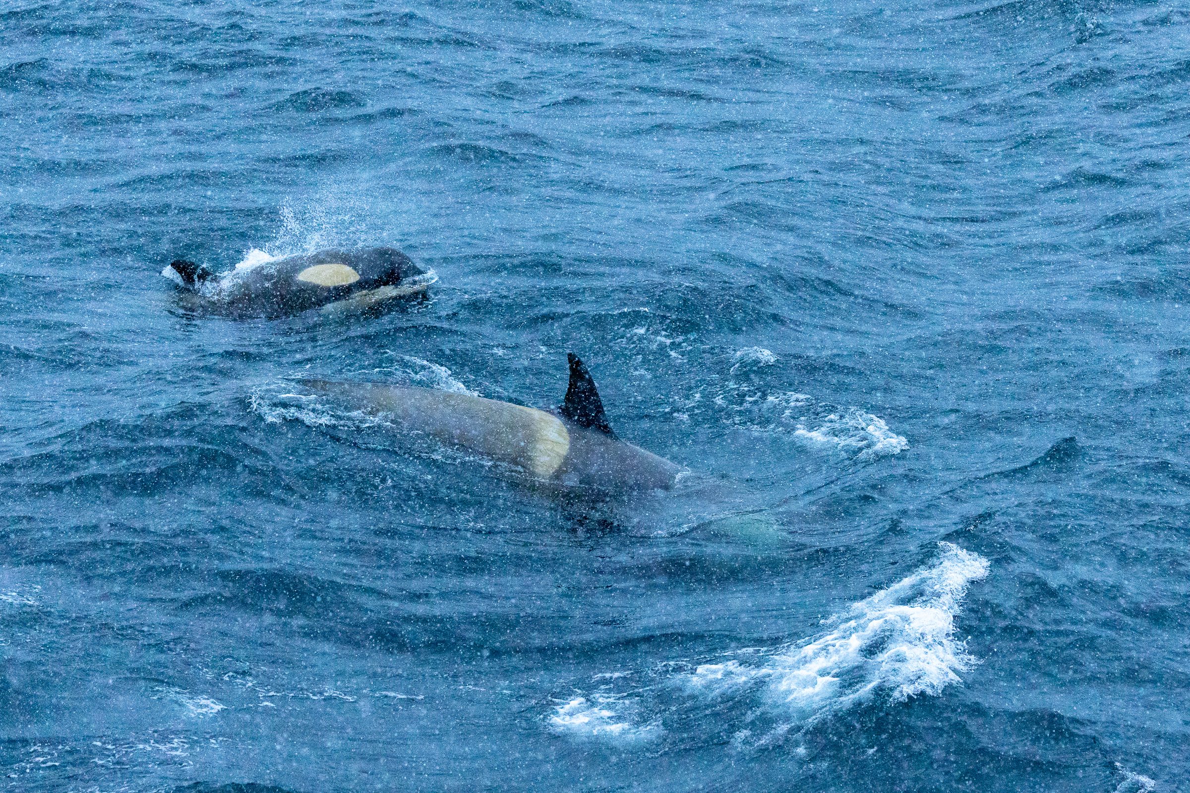 Shortly after I decided to run up to deck 8 where a lot of other participants and leads had gathered. As it turned out, the orcas were hunting some seal that had decided to use our ship as an attempt to hide from the orcas. It was INCREDIBLE! Even though it was snowing heavily and none of us had been up for longer than 10 minutes, the atmosphere was great and everyone was excited. The orcas continued to swim around the ship and at one point they even swam with the ship, allowing us to capture some great images of the experience.