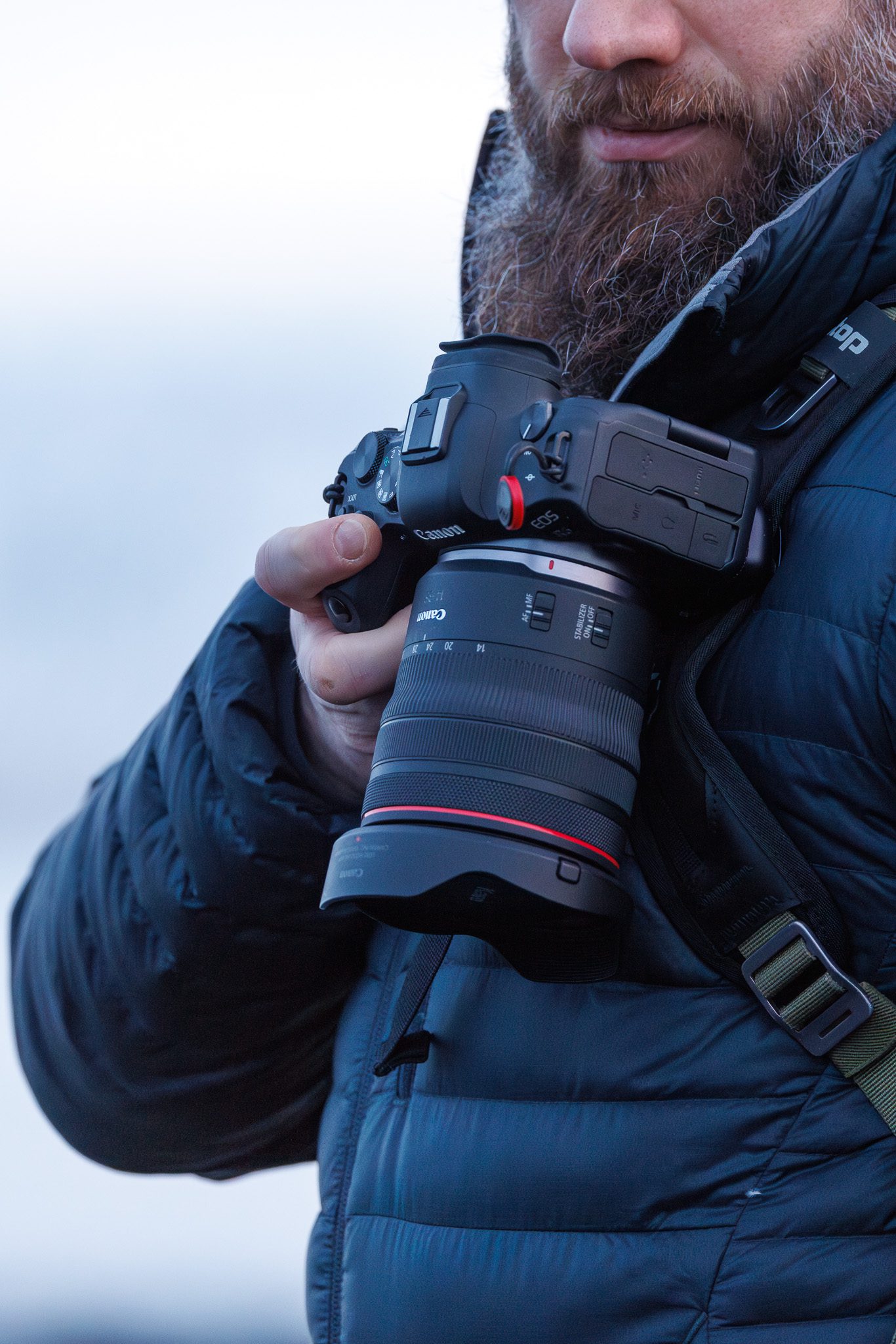 Inside of the f-stop Ajna DuraDiamond backpack you can organise everything to your liking by using different camera inserts. There are several, differently sized, camera inserts which allow you to optimise the space inside to fit all your gear. I have two main camera inserts: the Medium Slope and the Pro Large. I primarily use the Medium Slope camera inserts, which fits my Canon EOS R5, Canon RF 14-35mm, Canon RF 100-500mm, a Canon EOS R6 backup body, a few wireless microphones, a DJI Pocket 3 and a set of filters nicely. The camera inserts fit the inside of the bag snugly and they clip into two small loops on the side of the bag which prevents the insert from falling out accidentally.